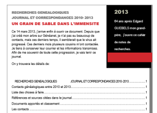 Ce journal a été clôturé au 31 décembre 2013, imprimé et relié. Je conserve un modèle consultable sur l’ordinateur, mais je l’ai verrouillé de manière à ce qu’aucune modification ne puisse y être apportée pour rester en phase avec la version imprimée .Si des éléments importants sont ajoutés, je les inscrits sur la page de gauche de mon carnet. Des modifications très importantes comme; l’ajout de nouvelles sources et informations seront notées dans le nouveau journal de 2014. Il est facile d’ajouter dans le journal de 2013 qu’il y a eu une suite en 2014. En espérant que ces notes puisse vous servir à créer votre journal, qui vous le verrez deviendra un compagnon fidèle de vos recherches. Et vous avez-vous créé un journal et comment l’avez-vous agencé ?