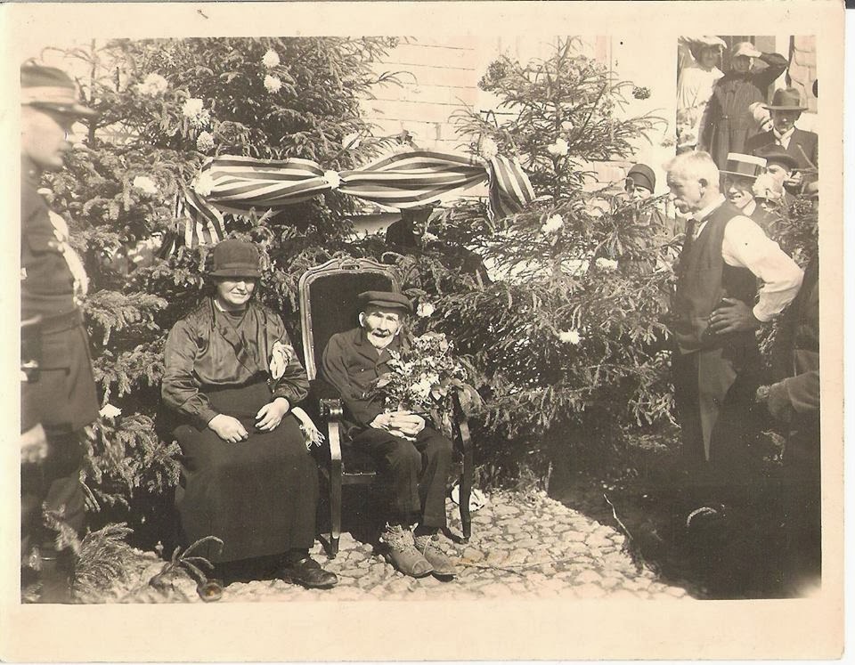 Un monsieur très âgé est assis dans un fauteuil Voltaire d’une bonne facture tenant un énorme bouquet de fleurs du jardin entre ces deux mains décharnées. Son visage émacié dont les orbites sont creusées, signe de son très grand âge. Il a été rasé de près pour le grand jour. Il porte la classique casquette que la plupart des anciens ont portée jusque dans les années mille neuf cent soixante. Ces chaussures sont étranges, on ne parvient pas à deviner si elles ont été resserrées à la cheville par de la ficelle ou des liens de laine. Elles semblent être en cuir lacées. L’ourlet du bas de son pantalon a été fait par une habituée de la couture, le bord est large et régulier. La veste qu’il porte est un peu trop grande pour lui et la casquette à l’air neuve. Il semble avoir été soigné aux petits oignons.