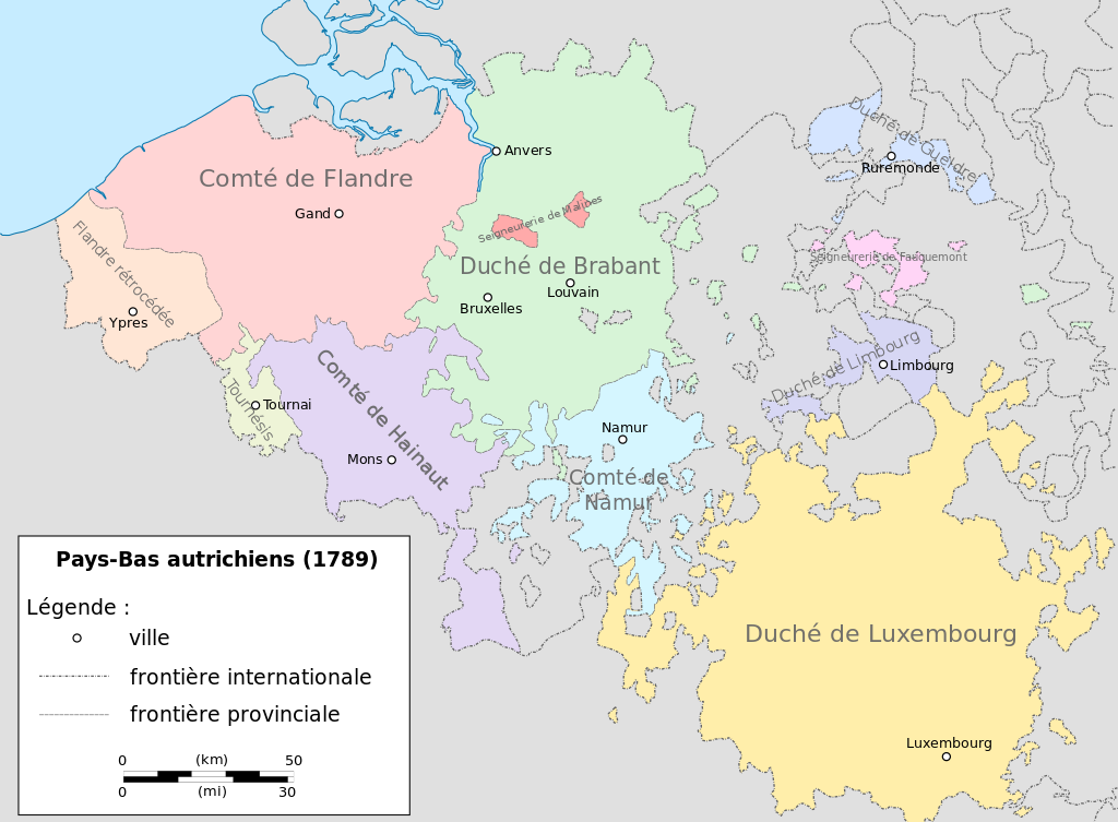 D’après : Carte : Faden, William « A map of the Austrian possessions in the Netherlands or Low Countries (1789), sur David Rumsey Map collection; Flandre rétrocédée : Delisle, Guillaume « Carte du Comté de Flandre (1704), sur Gallica.bnf.fr.