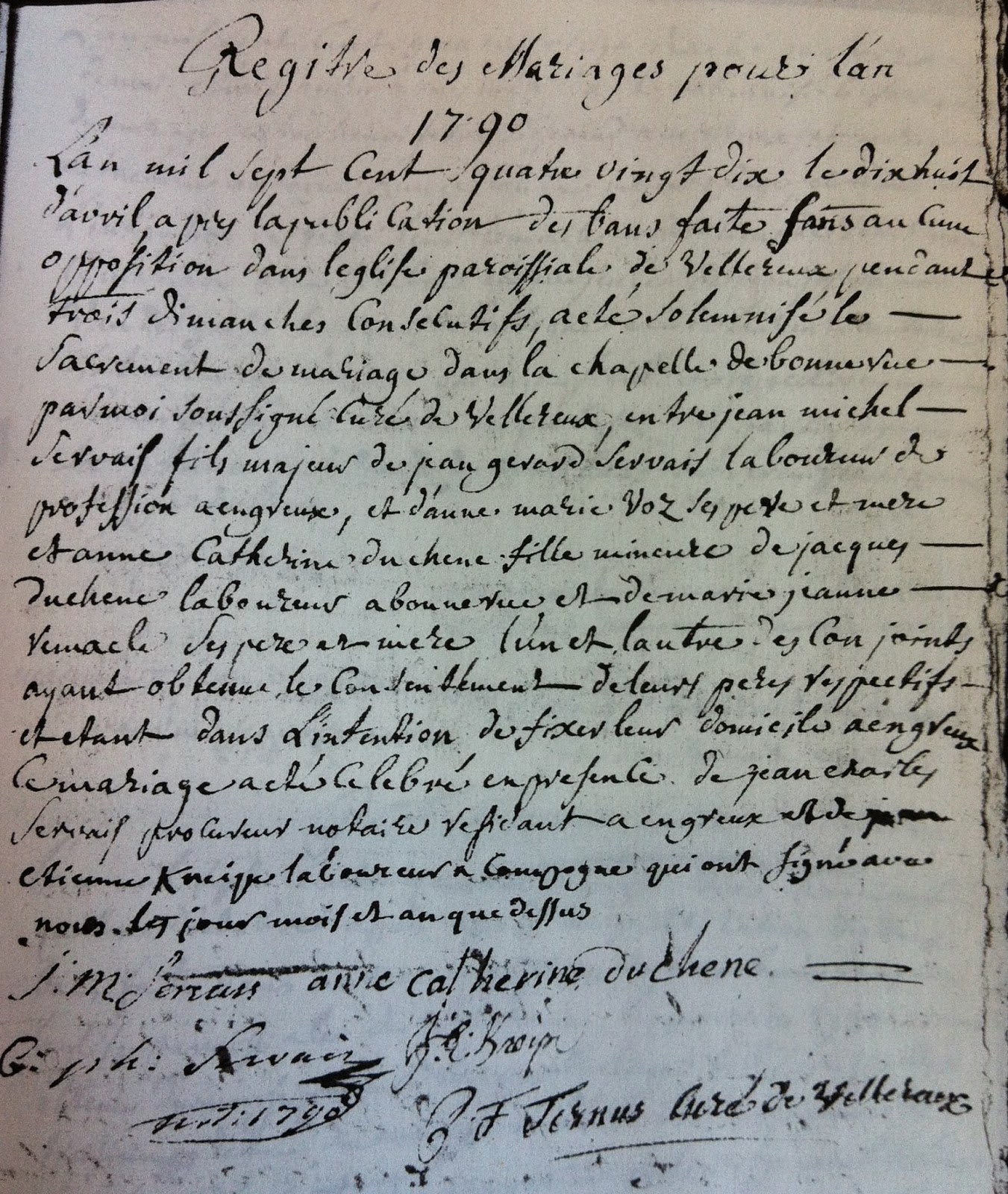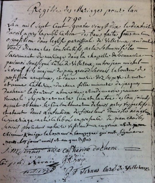 Cette page extraite du registre des mariages de l’an 1790 a été remplie d’une jolie écriture à la plume. L’expression sonore de la joie de ma découverte a fait relever la tête à tous les membres de la salle de lecture. Tous m’ont félicité pour ma trouvaille ! Une joie partagée est tellement irradiante. Voilà près de dix ans que j’attends cet instant. Trouver une preuve de la véracité de ce lien que j’avais lu sur généanet sans plus d’autres indications.
