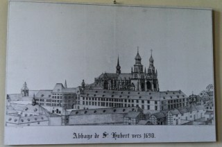 Arrivée sur la place, j’aperçois la basilique, le carillon sonne l’hymne à la joie, heureux présage ! Je tourne la tête et surprise, un magnifique bâtiment très coloré et couvert de dorure éclate de lumière sous le soleil ! Les archives de l’Etat se trouvent dans l’abbaye Royale de Saint Hubert, juste à côté de la Basilique.