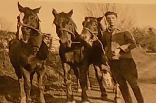 J’aimerais aussi vous présenter cet autre collègue. Il me semble que c’est un ratier, il était réputé très intelligent. Son maître Georges LEPERE, né au début de 1900, l’emmenait partout avec lui. Il l’aidait énormément dans son travail d’éleveur de chevaux. Son nom était Flic. Il est venu dans cette famille au retour de la guerre. Flic était un excellent chien, d’après l’oncle Pierre. Regardez bien, il est à l’arrière des pattes des chevaux.