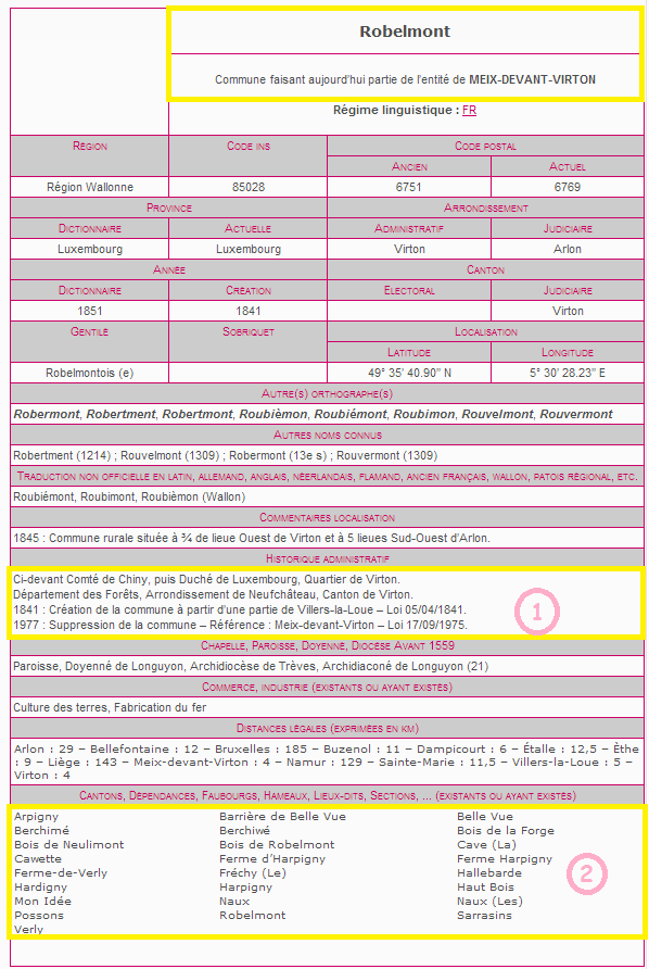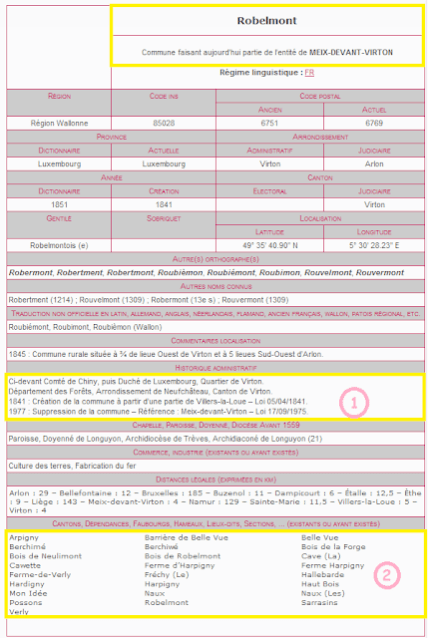 Les infos obtenues sont nombreuses mais celles qui sont les plus intéressantes sont celles contenues dans « Historique administratif » (1) et les « listes de cantons, dépendances, hameaux, lieux dits… ayant existé ou existant. » (2)