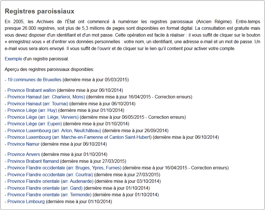 Il suffit de sélectionner le genre de registre « état civil » ou « paroissiaux » et de choisir la province (voir notre Belgique plus haut).