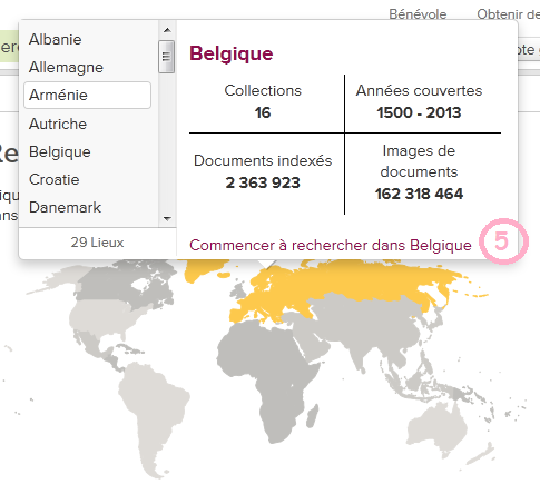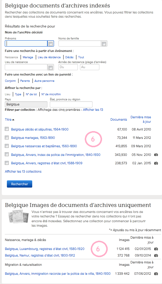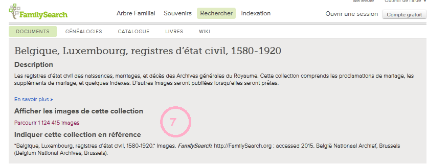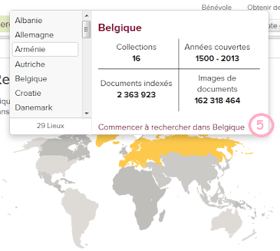 Choisir le continent puis le pays (4) et « commencer à rechercher dans (5) (Belgique pour moi) » et ensuite la « collection » (6) qui vous intéresse (si besoin d’info pour la province voir plus haut) et enfin « parcourir » (7)