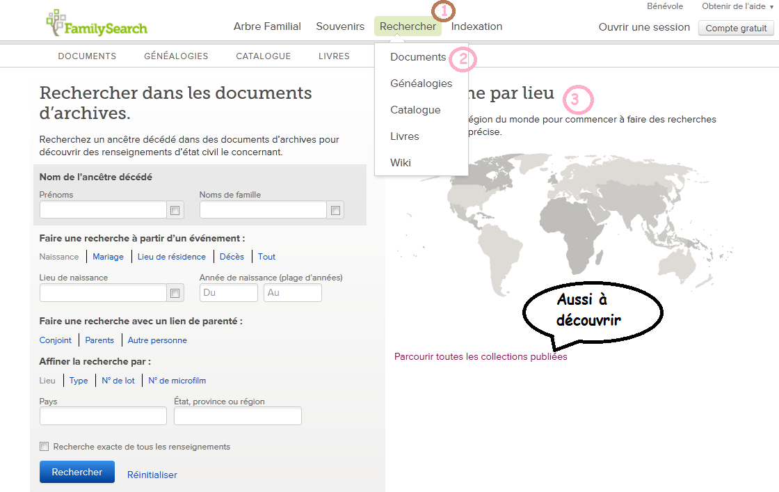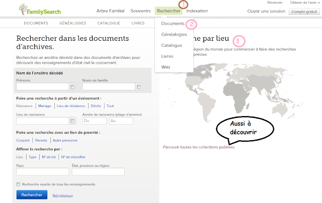 Dans l’ordre il faut suivre les onglets « rechercher (1)- Documents (2) » « rechercher par lieu »(3)