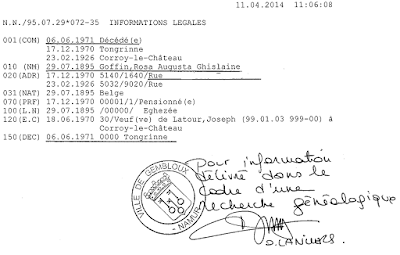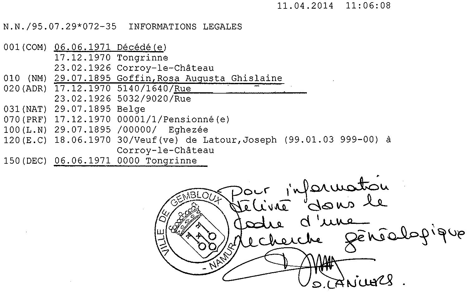 En téléphonant pour chercher des infos sur Arrières Grand parents de mon compagnon (Commune de Gembloux), j’ai reçu les actes de décès, l’acte de mariage ainsi qu’une fiche d’informations assez intéressante. (Fiches dont la plupart d’entre nous ignorent l’existence)