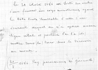 Transcription de l’acte : « Le 21 aout 1646 est sorti du ventre d’une femme un corps monstrueux ayant la tête toute semblable à celle d’un écureuil auquel on n’a apercu aucun signe vital et en partant l’on l’a (été) mettre dans (la terre) sans le découvrir au monde. »