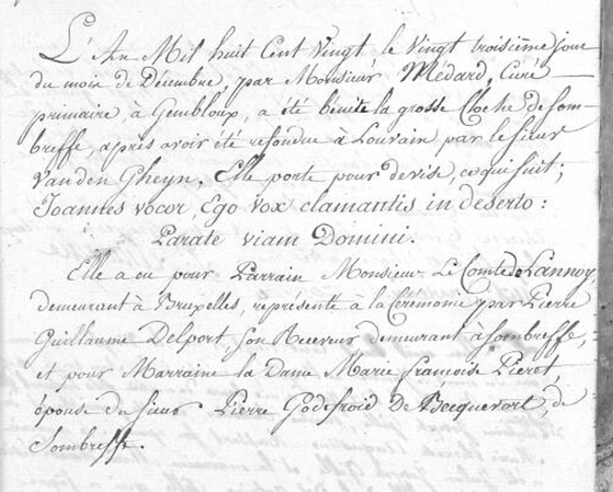 Elle a eu pour parrain Monsieur Le Comte LANNOY demeurant à Bruxelles représenté à la cérémonie par Pierre Guillaume DELPORT, son receveur demeurant à Sombreffe et pour marraine la Dame Marie Francoise PIERET épouse du Sieur Pierre Godefroid de BECQUEVORT de Sombreffe.