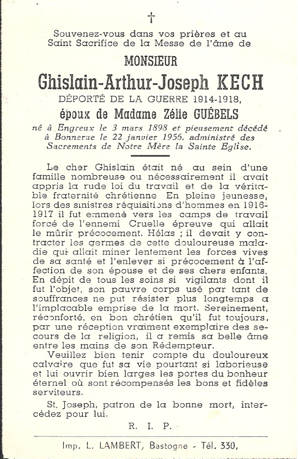 On y apprend que Ghislain fût déporté de la guerre 1914-1918, « en pleine jeunesse lors des sinistres réquisitions d’hommes en 1916-1917, il fût emmené vers les camps de travail de l’ennemi. Hélas ; il devait y contracter les germes de cette douloureuse maladie qui allait miner lentement les forces vives de sa santé et l’enlever si précocement à l’affection de son épouse et de ses chers enfants. » (On peut supposer qu’il est revenu d’Allemagne avec les germes de la tuberculose, il avait 18 ans lorsqu’il fût emmené).