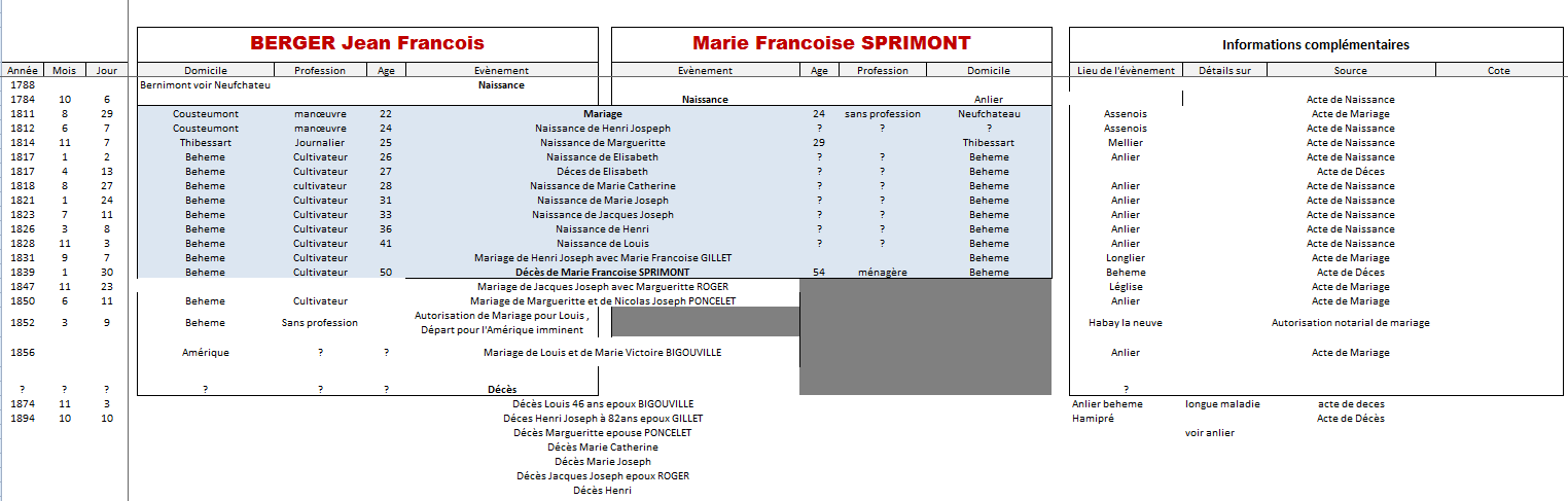 Voici la liste retrouvée et éclaircie avec notés la naissance, le mariage et le décès. Ce qui date d’après le départ de Jean-François est souligné. Le reste c’est passé dans le Luxembourg.
