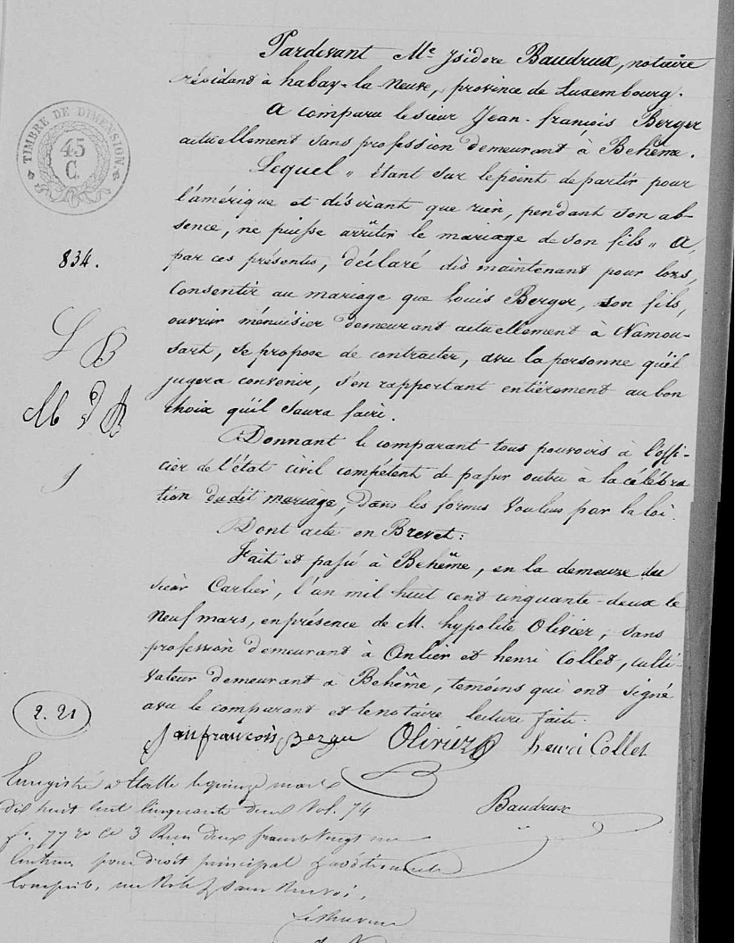 Lequel « étant sur le point de partir pour l’Amérique et désirant que rien, pendant son absence ne puisse arrêter le mariage de son fils » a par ces présentes, déclaré dès maintenant pour lors consentir au mariage que Louis Berger, son fils, ouvrier menuisier demeurant actuellement à Namoussart, se propose de contracter, avec la personne qu’il jugera convenir, s’en rapportant entièrement au bon choix qu’il saura faire.