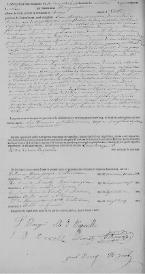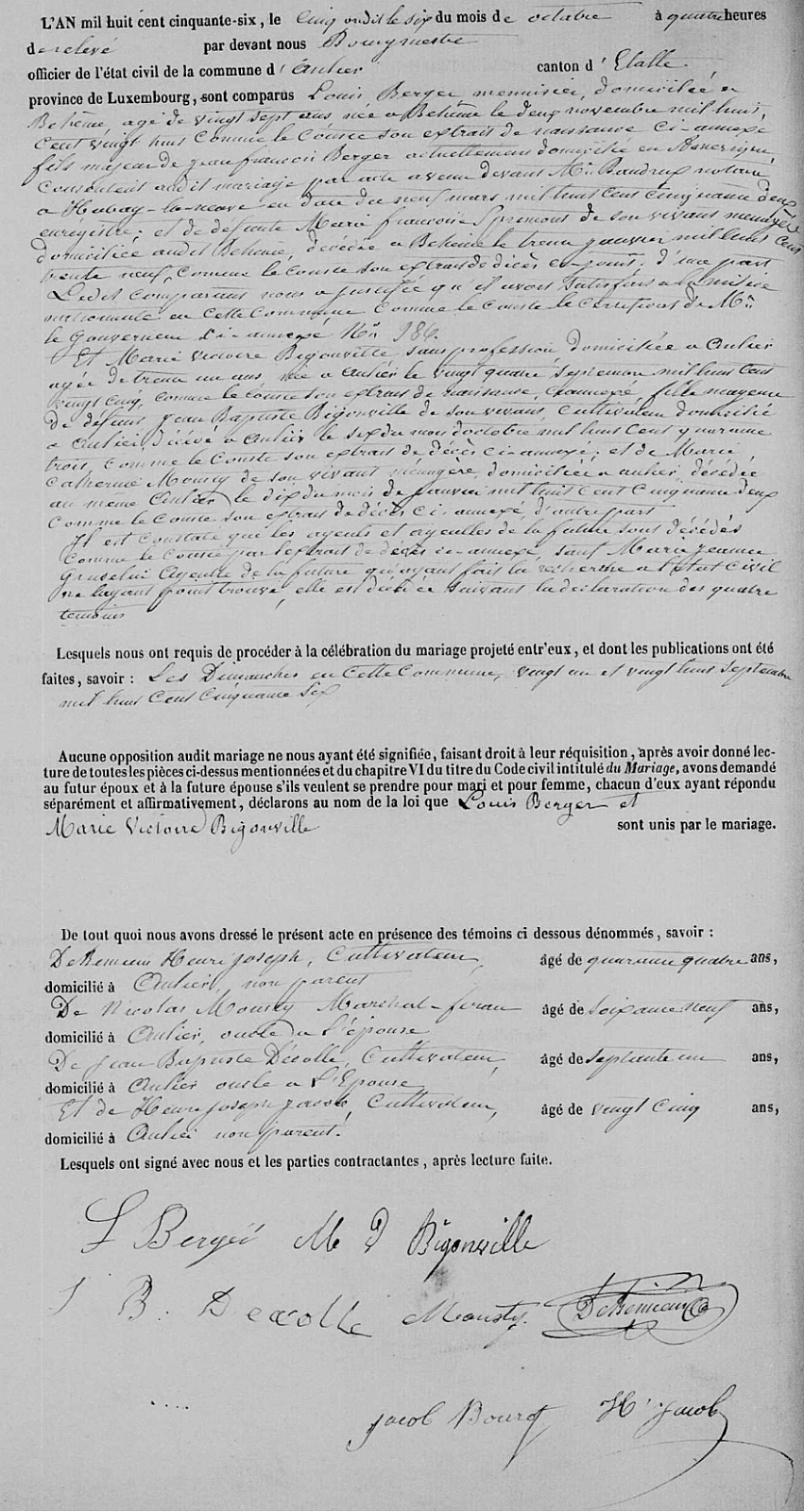 Le 6 octobre 1856, quatre ans après, Louis fils de Jean François BERGER âgé de 27 ans se marie avec Marie Victoire BIGOUVILLE On sait donc que son père n’est pas revenu car il est dit domicilié en Amérique (ligne 7 de l’acte ci-dessous), mais aurait-il été prévenu d’un éventuel décès ?
