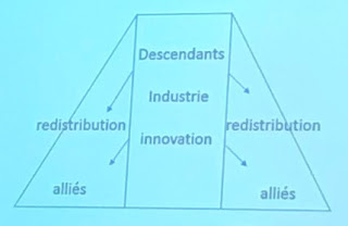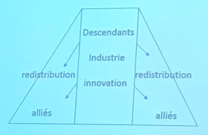 Les alliés restent en dehors de l’arbre, comme les filles et les descendantes. Les descendants alliés sont notés s’ils s’inscrivent dans un esprit d’entreprise et ont donc une valeur d’apport financer. C’est cet élément qui donne la raison au fait que les descendantes féminines ne sont pas renseignées car elles font sortir la richesse pour la mettre dans un autre lignage. Ainsi qu’il est décrit sur cette pyramide. Les porteurs masculins de nom montre qu’ils sont issus à 80% de la bourgeoisie et à 20% de la noblesse, les femmes sont représentées par moitié-moitié.