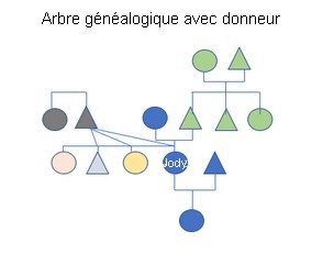 La parenté homme = triangle et Femme = Cercle. Jody est indiquée en bleu ainsi que son conjoint et sa fille et aussi sa mère. Son père et sa fratrie est en vert. Le donneur est en gris ainsi que sa sœur et les enfants nés sont en rose, orange et bleu ciel, fratrie de Jody.