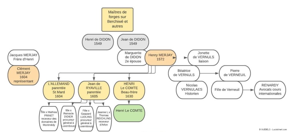 1630 – Berchiwé et les autres forges – Henri Le COMTE (- 1676), est un exemple de réussite, il reprend et après lui son fils Henri, les 4 usines de forges de Berchiwé, celle de Breuvanne et de Houdemont, il créera Huombois et Rawez-Saint-Vincent et prendra à ferme Montauban-Buzenol, il créera ce qui s’appellera plus tard le fourneau MARCHANT à Sainte-Marie et la forge de Rabay (Virton). Son beau-frère est Henry MERJAY. Ses successeurs en 1680 seront JACQUESSE et MATHELIN.