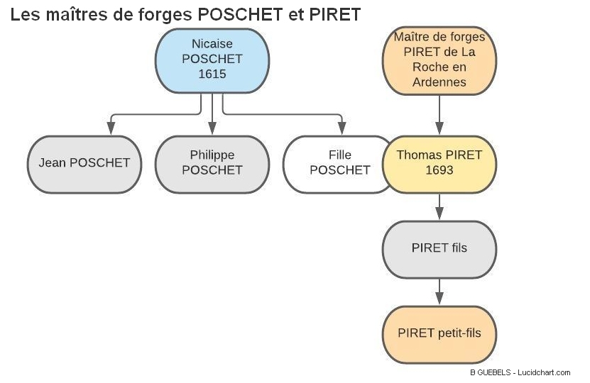1693 – Le gendre de POSCHET, Thomas PIRET fils d’une lignée de maître de forges de La Roche en Ardennes reprendra la forge Roussel à Lacuisine et le fourneau Pierrard, ces fils continueront dans cette voie et créeront une quatrième génération dans cette dynastie de sidérurgistes luxembourgeois.