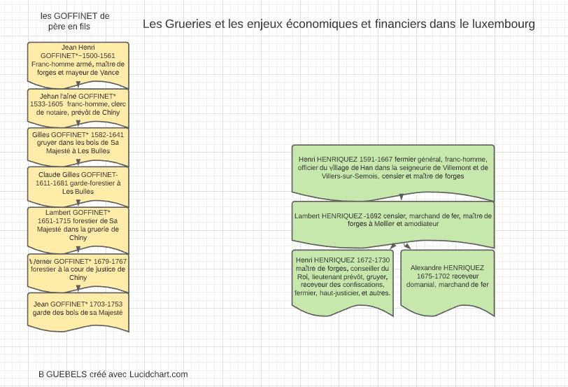 Deux familles occupent des fonctions importantes dans la gestion des bois et vont sortir du lot: les GOFFINET mes ancêtres et les HENRIQUEZ, qui sont aussi des gens de fer. Ils couvrent ainsi une grande partie de la Gaume lorraine. Bien que les titres de fonctionnaires ne soient pas héréditaires, il est convenu d’acheter les postes et bien entendu, un père bien vu permet ces introductions auprès des supérieurs.
