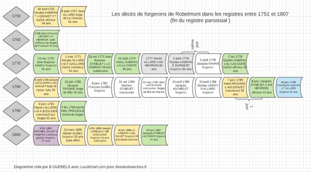 Une mort peut sembler normale, si l’on ajoute un acte pour monter son arbre généalogique, ajouter les détails ne fait pas prendre vie au personnage ainsi noté, tout au plus peut-on constater qu’il est mort assez jeune. Mon attention a été attirée par le nombre de décès dans une période de plus de 50 ans, en effet au plus le registre se remplissait au plus il y avait de morts. Cela pouvait paraître logique puisque la population de Robelmont augmentait avec la prospérité des forges, tout de même, il me semblait qu’il y avait beaucoup de forgerons parmi eux.