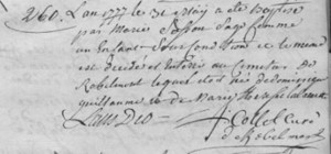 Transcription : L’an 1777 le 3e May a été baptisé par Marie SOSSON sage-femme, un enfant sous condition et le même est décédé et enterré au cimetière de Robelmont lequel était né de Dominique GUILLAUME et de Marie Thérèse LALLOUETTE. Laus Dio H COLLET curé de Robelmont.