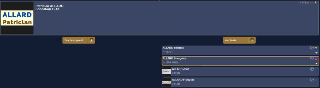 Par exemple, le premier patronyme ALLARD que je découvre se situe en génération 12 avec pas moins de onze individus qui ont forcément eut un père et une mère. Pour le moment, Je ne connais pas les liens entre eux, mais les recherches ne sont pas terminées. Chacun de ce groupe d’individu peut être relié par le fondateur du clan, dont la génération est G12 – 1 soit G 13.
