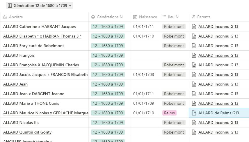 Lorsque je rentre les données dans Notion, c’est au fil de mes découvertes récentes, il existe pourtant dans Heredis tout un tas de personnages rentrés au fil des années parce qu’ils ont un lien avec ma généalogie. A vrai dire, ce sont les personnages “flottants” dont les informations se perdent, par manque de clarté et pourtant ils peuvent nous mettre sur de nouvelles pistes.