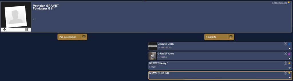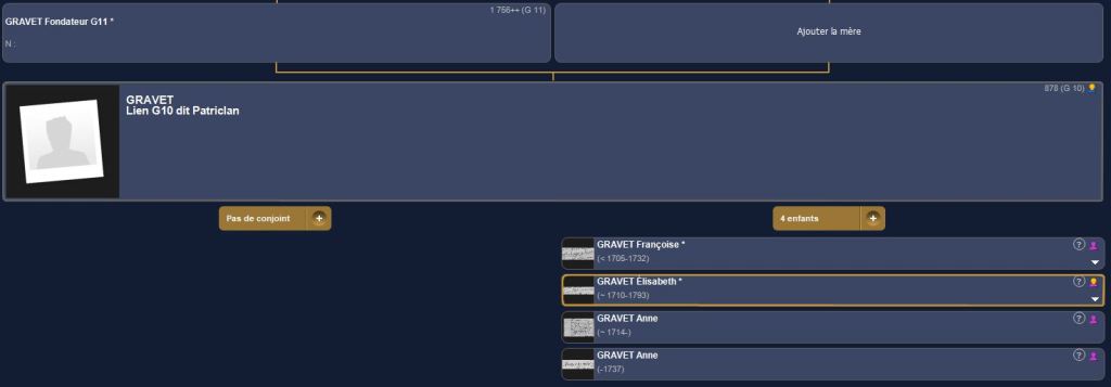 Le “père” de ce GRAVET Lien est GRAVET fondateur G11 et il lie 4 individus qui sont nés à la génération 9 et qui ont très peu de probabilités d’être l’enfant du fondateur. Il est possible qu’ils soient les enfants des personnes de la Génération 10, mais nous n’en avons pas les traces.