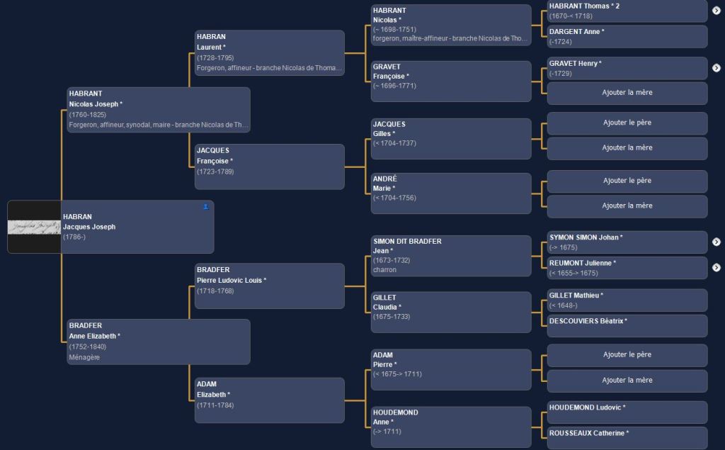 - Son grand-père est Laurent HABRANT * (1728-1795) forgeron, affineur et sa grand-mère Françoise JACQUES * (1723-1768)