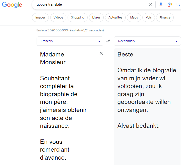 - Si la commune de vos proches se trouve en flandre, je vous conseille d’utiliser Google translate:
