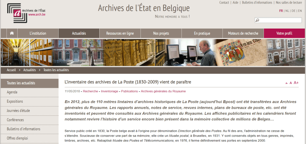 « En 2012, plus de 110 mètres linéaires d’archives historiques de La Poste (aujourd’hui Bpost) ont été transférées aux Archives générales du Royaume. Les rapports annuels, notes de service, revues internes, plans de bureaux de poste, etc. ont été inventoriés et peuvent être consultés aux Archives générales du Royaume. Les affiches publicitaires et les calendriers feront notamment revivre l’histoire d’un service qui occupe encore la mémoire collective de millions de Belges… «