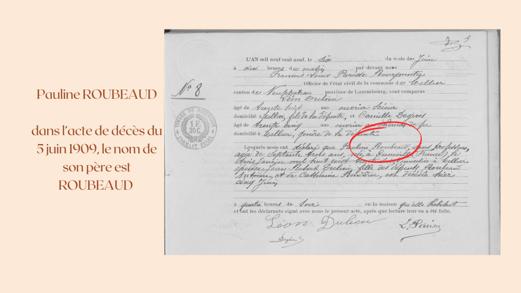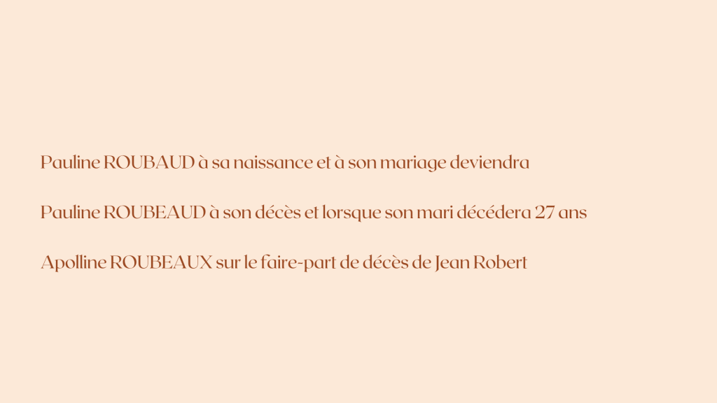 ROUBEAUX Apolline ! C’est ainsi que le faire-part de décès de Jean Robert est rédigé en 1930. Pauline est décédée en 1909, comme indiqué plus haut.