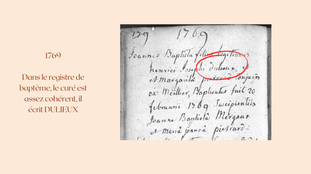 En remontant quelques actes de nos ascendants communs, dans les registres BMS. Nous pouvons voir que le curé écrivait avec une certaine cohérence la naissance de Joannes Baptista fils légitime de Henrici Josephi DULIEUX le 20 février 1769.