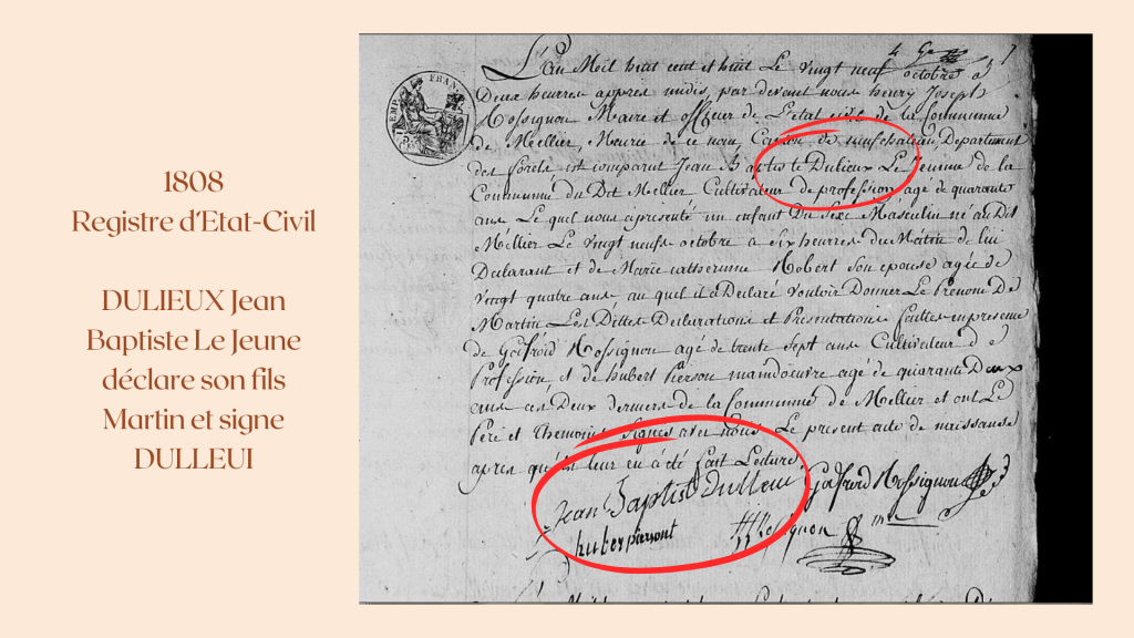 1808.10.29, Henry Joseph ROSSIGNON, maire et officier d’état-civil écrit, Jean Baptiste DULIEUX Le Jeune, cultivateur âgé de quarante ans, époux de Marie Catherine ROBERT, déclare un fils MARTIN et signe Jean Baptist DULLEUI