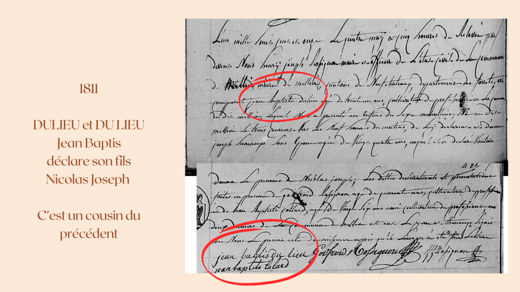 1811.05.03, il est écrit par l’officier d’état-civil, maire, Henry Joseph ROSSIGNON, Jean Baptiste DULIEU, trente un ans, cultivateur, époux de Anne Joseph HURIAUX déclare son fils Nicolas Joseph, et signe Jean Baptis DU LIEU
