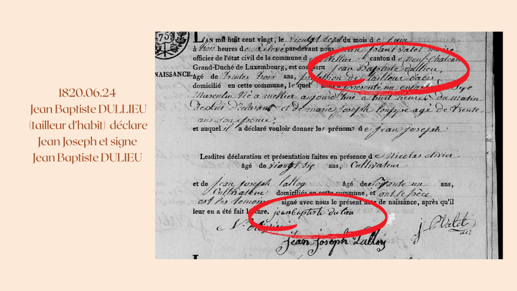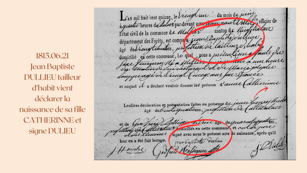 1815.06.21, il est écrit, Jean Baptiste DULLIEU, tailleur d’habit époux Marie Joseph LOUPPE vient déclarer la naissance de sa fille Anne Catherinne (avec 2 n). Jean Baptiste signe DULIEU !