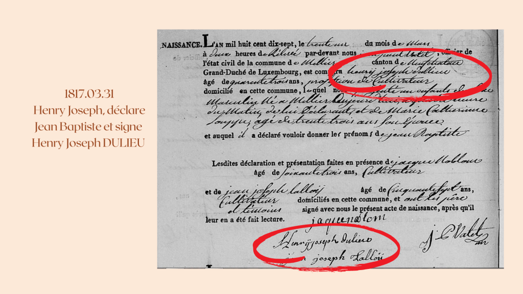 1817.03.31, il est écrit, Henrij Joseph DULLIEU, cultivateur, époux de Marie Catherinne LOUPPE déclare un fils, Jean Baptiste, il signe Henry Joseph DULIEU.