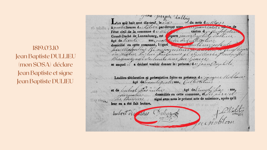 1819.03.10, il est écrit, Jean Baptiste DULLIEU, trente ans, cultivateur, époux de Marie Françoise MERGAUX déclare un fils Jean Baptiste (ce couple sont mes SOSA). Il signe DULIEU, d’une belle signature travaillée.