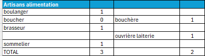 Les métiers de l’artisanat alimentaire est très faible, à peine 1%, de boulanger, bouchère, brasseur, sommelier et une ouvrière de laiterie nommée « turbinage du lait ».