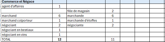 Les commerces et négoces : représentés à presque égalité avec 12 hommes et 11 femmes.