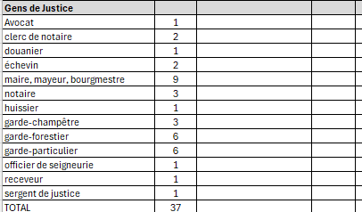Les gens de justice, que j’ai nommé ainsi parce qu’ils ont prêtés serment pour défendre la justice et la loi. Ils sont avocat, clerc de notaire, notaire, douanier, échevin, mayeur, bourgmestre ou maire, huissier, garde-champêtre, garde-forestier, officier de seigneurie, receveur et sergent de justice. Il n’y a aucune femme. Là encore c’est un corps de métiers qui est largement représenté dans mon arbre, malheureusement les femmes sont oubliées.