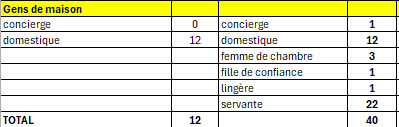 Les gens de maisons : concierge, domestiques, femme de chambres, fille de confiance, lingère et servantes sont au nombre de 40 pour 12 hommes domestiques.