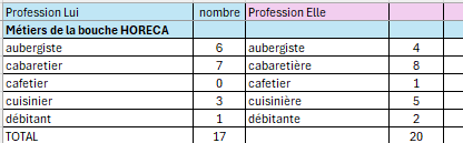Les métiers de la bouche : restaurateurs, cuisinier, aubergistes, cafetiers et cabaretiers sont de 17% et un nombre presque équivalent d’hommes et de femmes (17 hommes et 20 femmes). Avec un biais qui est le changement de profession en fonction du rédacteur ainsi, la même personne pouvait tour à tour être aubergiste, débitant, cabaretier et les femmes devenait bizarrement sans profession.