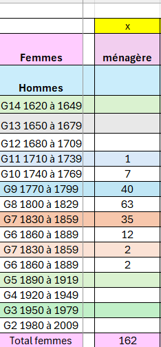 Les résultats les plus anciens sont à la génération 14 de 1620 à 1649 où sans surprise, il n’y a qu’une sage-femme dans les registres. Tout simplement parce qu’elle a déclaré un enfant qu’elle a mis au monde après avoir accouché en tant que sage-femme, la mère de ce petit. Il y a rarement des professions de femmes citées dans les registres tenus par les curés. En tout cas dans la région que j’ai étudiée. Nous reviendrons sur les biais d’analyse par la suite.