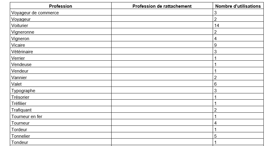 La deuxième étape a été de faire un fichier Excel et de classer les professions par ordre alphabétique. C’est l’étape la plus ennuyeuse qui soit, il est facile de sauter des lignes, de tout recompter, surtout si vous êtes assaillie par un chaton explorateur. Pour avoir une idée de l’époque à laquelle ces femmes exerçaient leur profession, j’ai ajouté les générations.