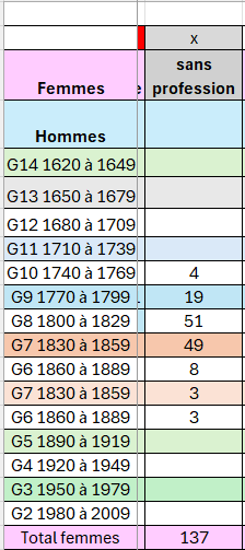 En sciences sociales, une génération représente 29 ans. Certains vont me dire que c’est 20 ans, c’est sans doute vrai pour certaines familles mais la plupart du temps les mariages arrivaient vers la trentaine pour les hommes et si on lisse tous les chiffres on obtient entre vingt-huit et vingt-neuf années. C’est un système qui a été éprouvé et approuvé. La génération G1 commence en 2010 et se terminera donc en 2039. Par souci de confidentialité, je n’ai pas tenu compte des générations G2 1980 à 2009, G3 1950 à 1979, G4 1920 à 1949, étant donné que ces personnes peuvent encore être en vie où sont décédés récemment. Afin de ne pas déséquilibrer l’ensemble, j’ai également ôté de cette étude toutes les nombreuses femmes de mon arbre avec un petit de ou d’, figurant la branche aristocratique où il n’était pas de bon ton d’avoir une « profession ».