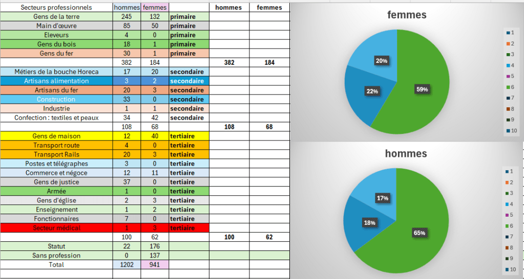 Le secteur primaire atteint le pourcentage le plus élevé avec 59% de femmes et 65% d’hommes. Parmi ce secteur, les gens de la terre atteignent 41% du total (249 hommes et 132 femmes).