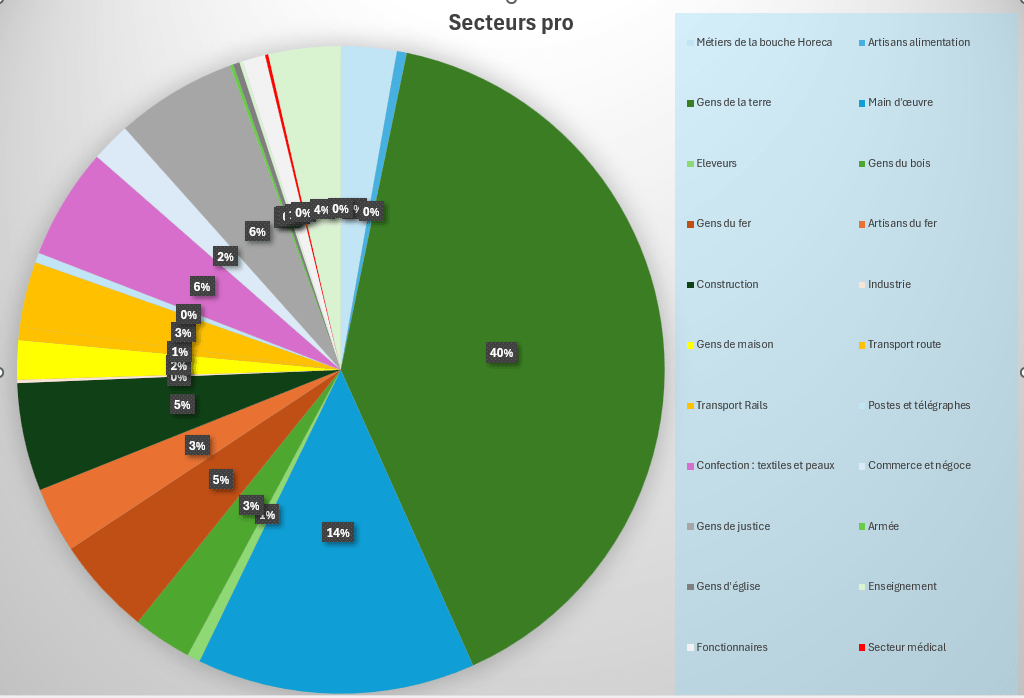 Le second avantage est celui d’avoir bien éclairci les secteurs professionnels des personnages de mon arbre. Si je ne suis pas étonnée de voir que le secteur agricole arrive en premier dans cette région rurale, je trouve qu’il n’y a pas vraiment assez de gens du fer et des bois. Les artisans sont peu représentés alors que le Luxembourg du XXe siècle est connu pour avoir été le pays des milles métiers. Reste à découvrir le travail des femmes.