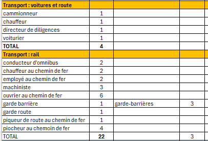 Le transport par route et par rail concerne majoritairement les hommes (24 hommes contre 3 femmes). Les femmes sont garde-barrière et leur mari est au chemin de fer. Une femme élève 11 enfants tout en exerçant ce métier.